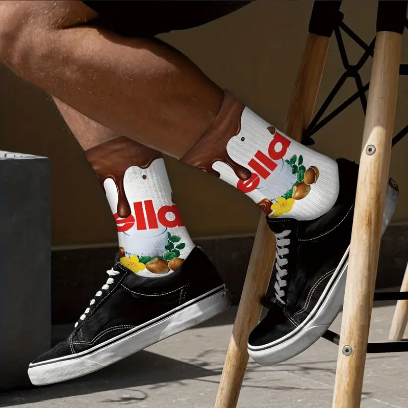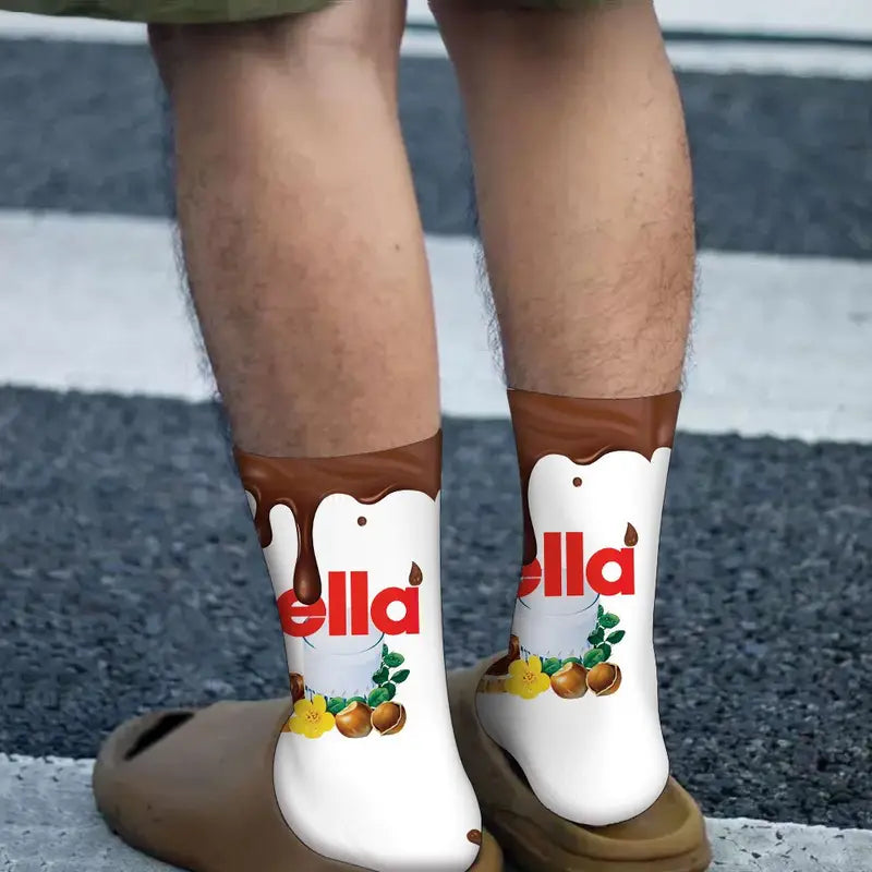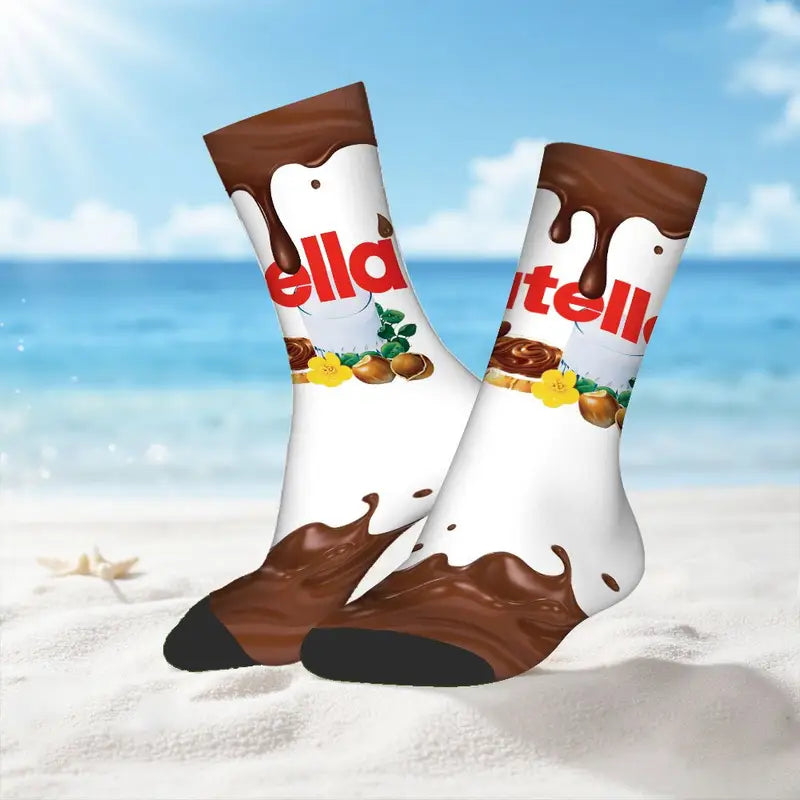 Experience unmatched comfort and style with these unisex novelty socks, featuring a fun rich chocolate hazelnut spread graphic. Crafted from durable materials, they offer a soft texture ideal for summer wear, whether you're at the beach, commuting, or playing sports like running and soccer. Their versatile design effortlessly complements casual and business looks, making them a perfect addition to your wardrobe for both fashion and function. Enjoy breathable, durable socks that keep you comfortable throughout your day.