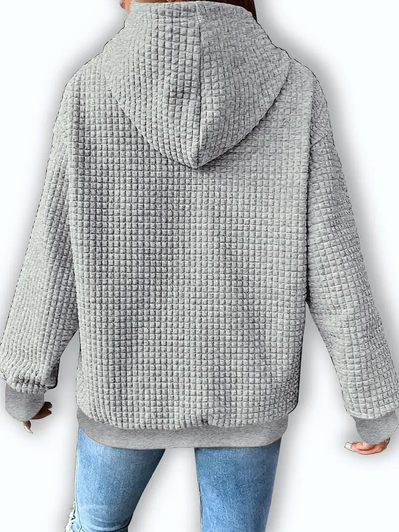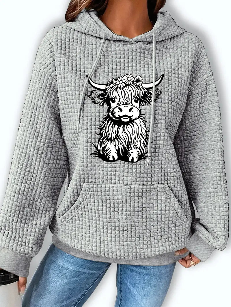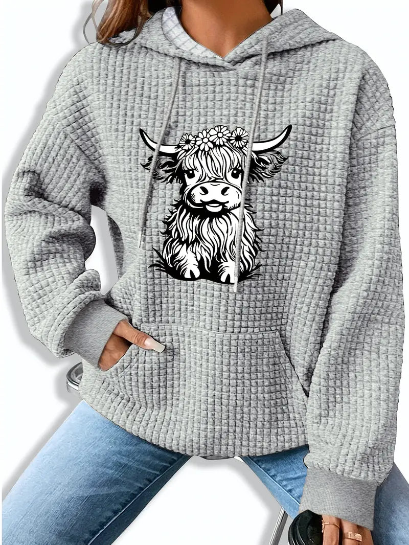 Stay cozy and stylish this fall and winter with the Graphic Print Waffle Hoodie. Designed with a drawstring hood and a convenient kangaroo pocket, it offers both warmth and practicality. The waffle-knit fabric provides breathable insulation, perfect for layering during cooler days. Tailored for women, this casual sweatshirt blends comfort with trendy graphic details, making it an essential piece for your seasonal wardrobe.